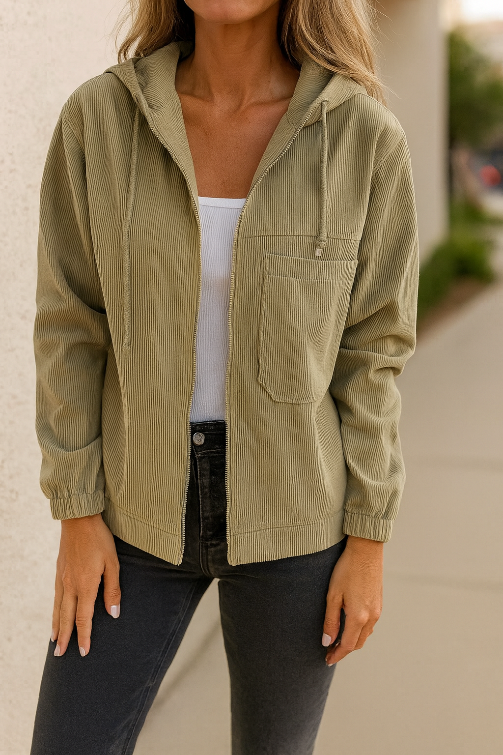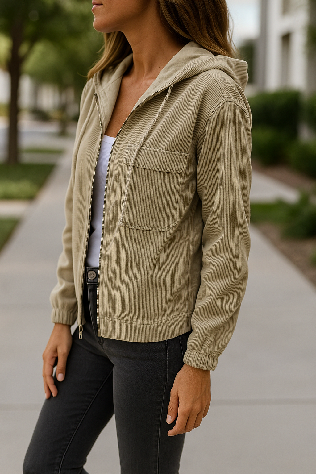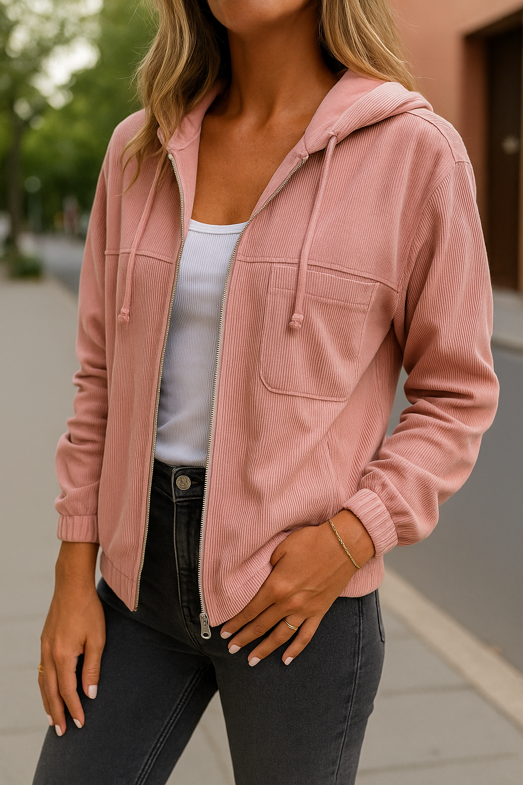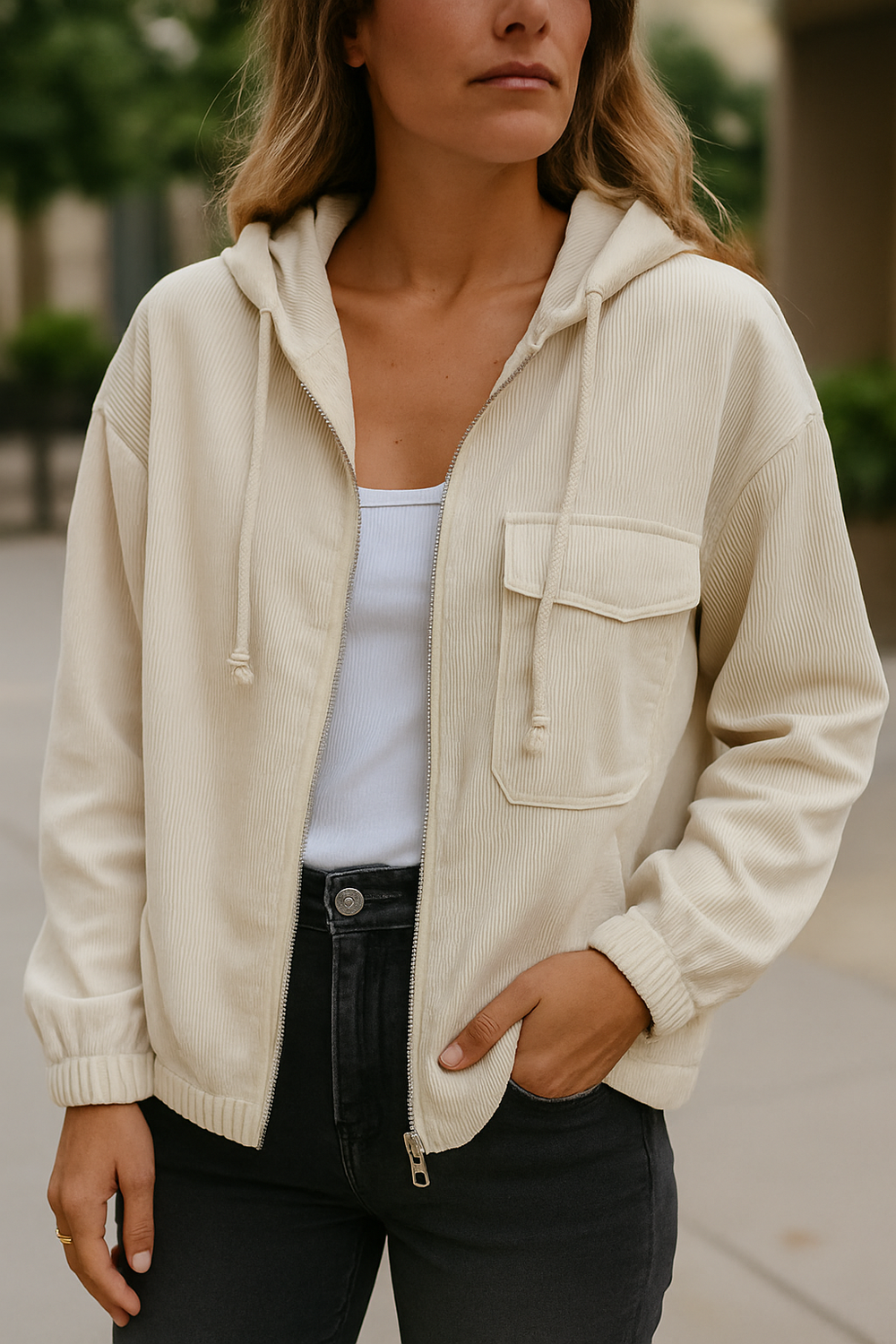 The plush corduroy fabric feels whisper-soft against the skin, while the relaxed hooded design and zip closure add a layer of functionality. It’s more than just a jacket — it’s a versatile companion for crisp morning walks, laid-back weekends, or casual evenings out.