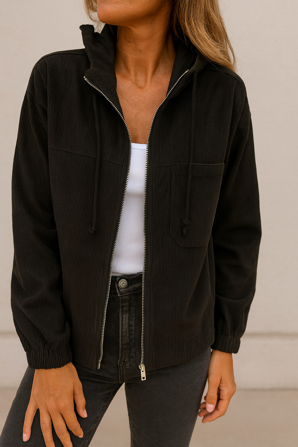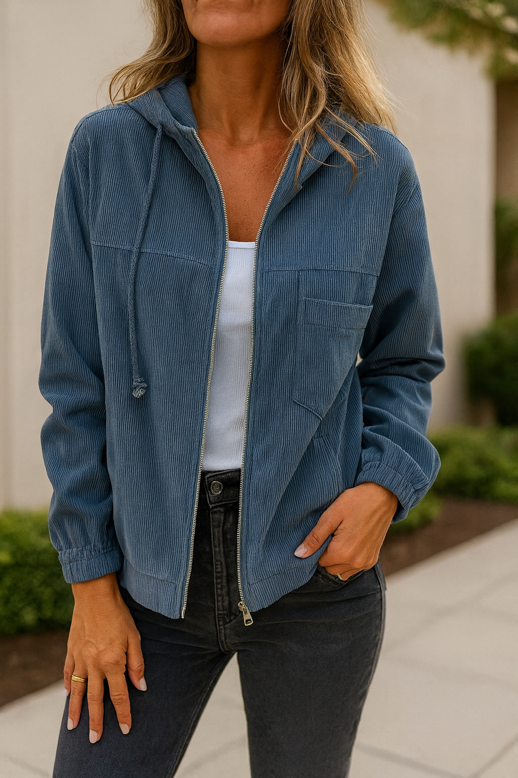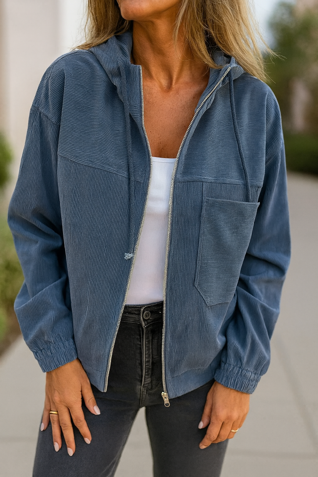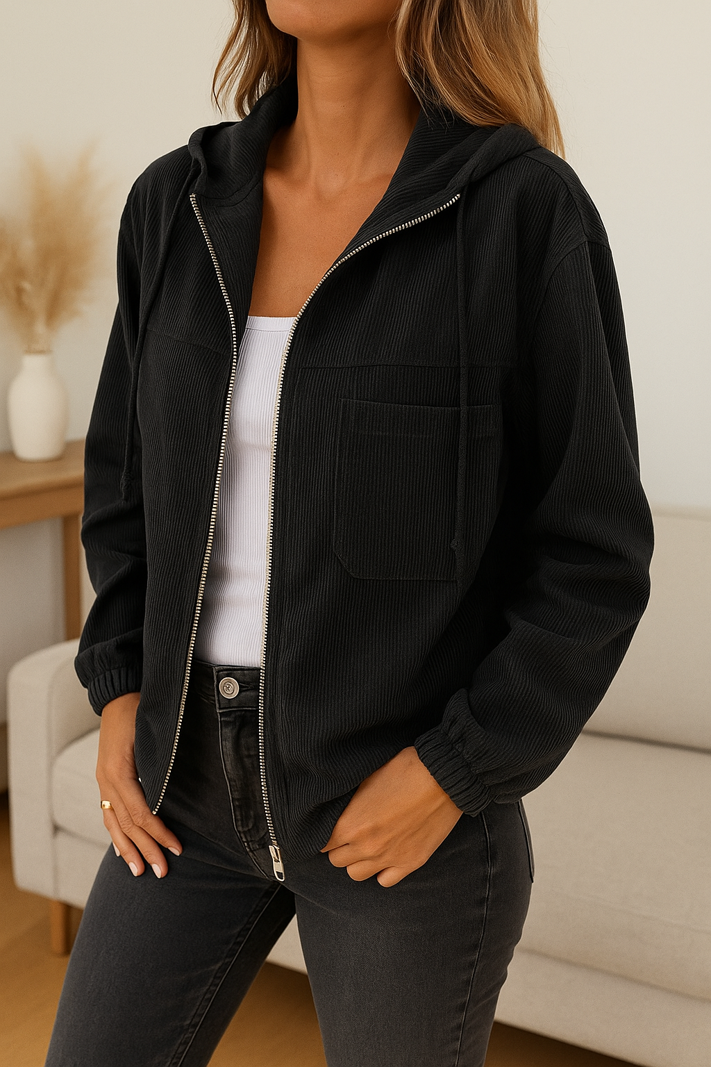 The plush corduroy fabric feels whisper-soft against the skin, while the relaxed hooded design and zip closure add a layer of functionality. It’s more than just a jacket — it’s a versatile companion for crisp morning walks, laid-back weekends, or casual evenings out.